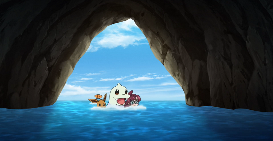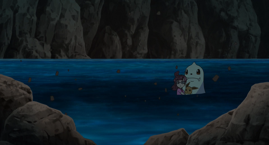 Chloe, Evoli und Jugong müssen feststellen, dass sie so einfach nicht wieder herauskommen und hoffen daher darauf, dass Ash und Goh nach ihnen suchen und sie befreien. Von außen und von unter Wasser versucht aber Aalabyss, mit Gewalt in das Innere vorzudringen.