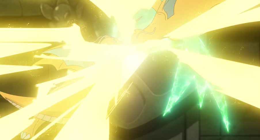Maxax legt auch gleich mit Drachenpuls los, was Pescragon mit Aquaknarre nicht abwehren kann. Durch die anschließende Psychoklingen-Attacke wird es anschließend entscheidend getroffen und geht K.O. Lilia erklärt, dass Maxax Pescragon bewusst aus der Distanz attackiert habe, um so dessen starken Kiefer zu meiden.