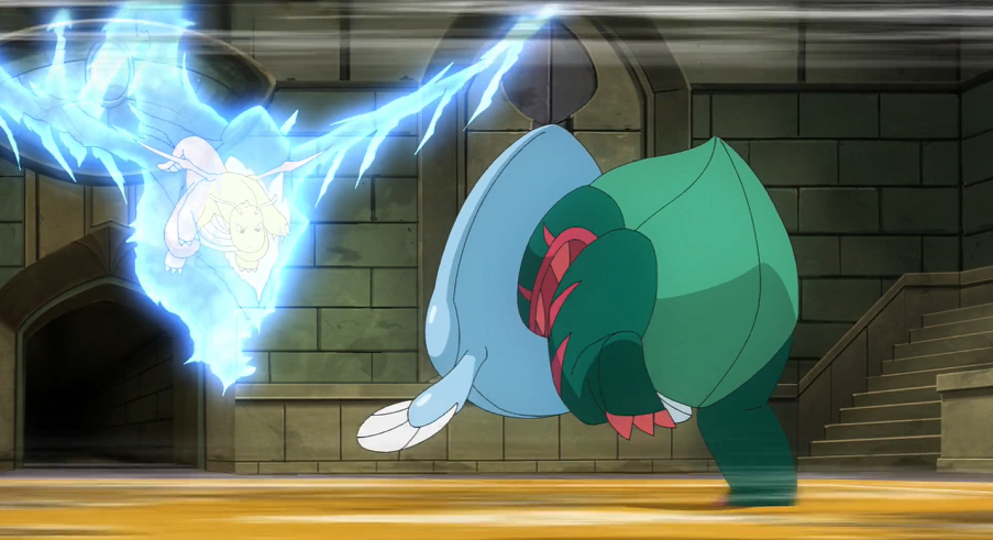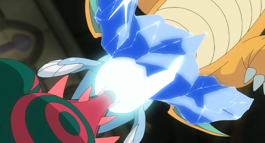 Pescragon ist gleich voll da und kann Dragorans erneuten Drachenstoß mit einer Biss-Attacke kontern und so Dragoran in seinem Kiefer gefangen nehmen, wodurch dieses keinerlei Attacke mehr einsetzen kann. Anschließend legt Pescragon mit Eiszahn nach, womit es Dragoran einfriert, um es dann auszuspucken. Dragoran landet kampfunfähig auf dem Boden.
