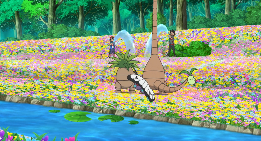 Nach einiger Zeit, als die Sonne bereits am Untergehen ist, müssen Ash und Goh enttäuscht feststellen, dass sie keinerlei Spur von den Blumen haben finden können. Lediglich pinke, noch nicht blühende Blumen haben sie unterwegs finden können. Da laut der Forscherin die weißen Blumen wohl nur sehr schwer wachsen, vermuten sie, dass den besagten Blumen etwas zugestoßen sein müsse.