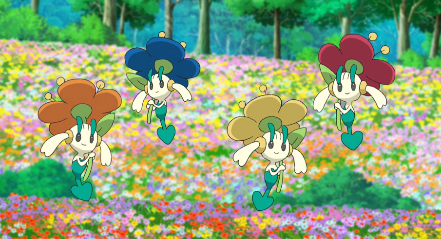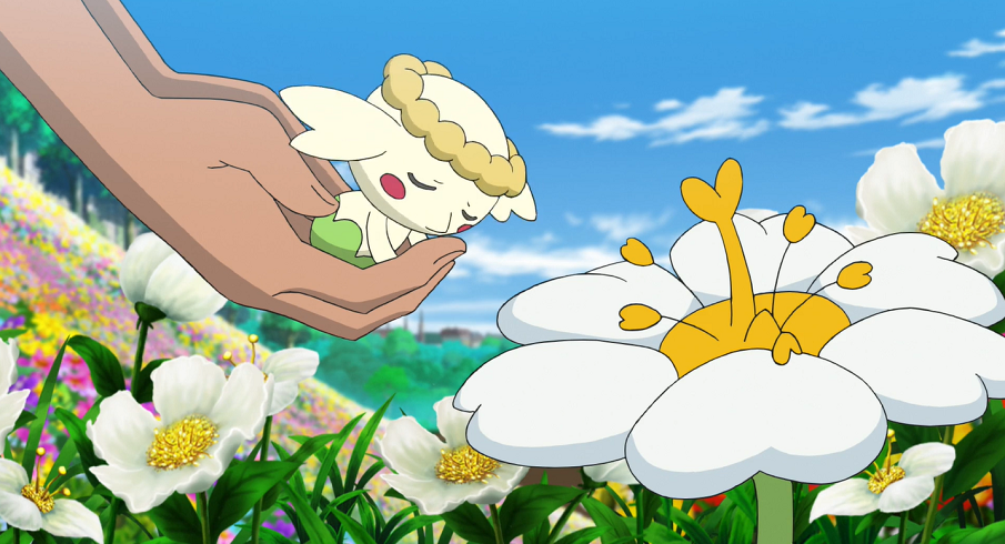 Ash und Goh gießen im Blumenfeld des Kirsch-Parks Gohs beide Kokowei, Myrapla und Knofensa, als auf einmal Gohs blaues, gelbes, oranges und rotes Flabébé im Eiltempo an den beiden vorfliegen und sich ein kleines Rennen liefern. Als sie zum Stillstand kommen, beginnen die vier Pokémon sich zur Freude der beiden jeweils zu Floette zu entwickeln. Doch schnell bemerkt Goh, dass sein weißes Flabébé fehlt und sich nicht entwickelt hat. Sofort machen sie sich auf die Suche nach dem Feen-Pokémon, das einen Augenblick später herbeigeflogen kommen. Allerdings nur sehr langsam und unrund. Als Goh es vor einem Sturz bewahrt und auffängt, bemerken sie, dass dem Flabébé eines seiner weißen Blütenblätter fehlt. Um Flabébé zu helfen, wollen die beiden für es eine neue Blume auftreiben. Da Flabébé aus der Kalos-Region stammt, erhoffen sie sich dort fündig zu werden.