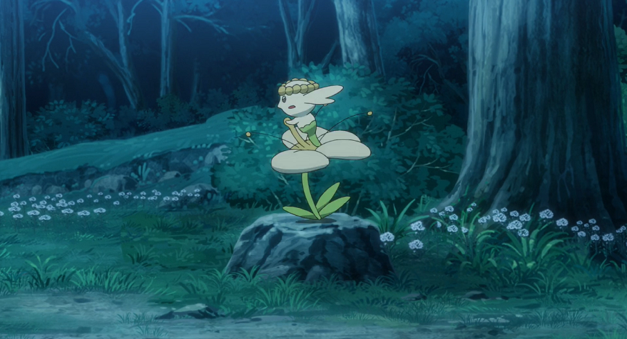 Als Flabébé, immer noch auf Gohs Kopf sitzend, in den Himmel schaut, sieht es ein Leuchten, woraufhin es Goh sofort anleitet, kehrtzumachen. So landen sie schließlich, als es bereits dunkel ist, wieder bei den pinken Blumen, die sie zuvor gefunden. Als nun jedoch eine Wolke am hellen Mond am Himmel vorbeigezogen ist, werden die pinken Blumen vom hellen Mondlicht bestrahlt. Dadurch werden sie weiß und beginnen zu blühen. Ash, Goh, Pikachu, Chimpep und Flabébé sind beeindruckt von dem Schauspiel. Flabébé wählt sich eine der Blumen aus, die es anschließend glücklich pflückt. Zudem taucht noch ein weiteres Flabébé auf, das zum ersten Mal eine Blume zu pflücken scheint und sich fröhlich auf dieser davon macht.