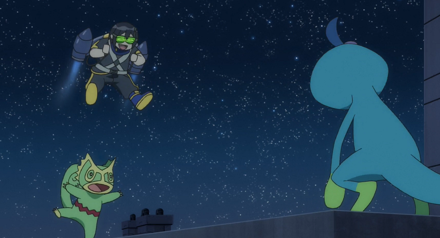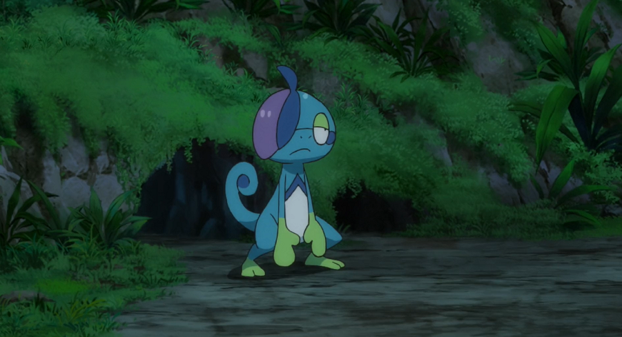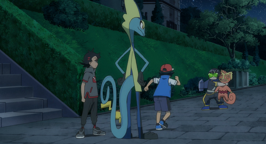 Ash und Pikachu sowie Professor Kirsch werden ebenfalls durch den Lärm geweckt. Ash trifft Goh, wie dieser gerade dabei ist, Kecleon auf das Dach zu folgen. Dort versucht Phlegleon den Anschluss zu halten.