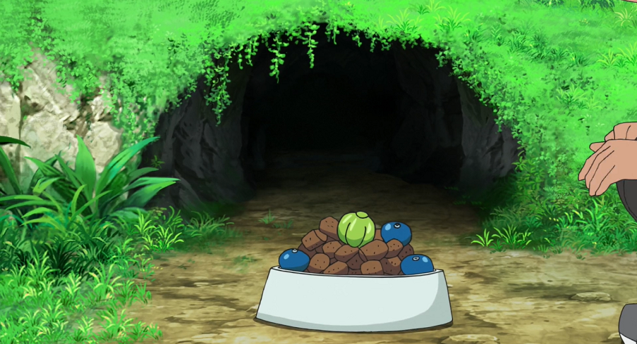Ash reicht Goh eine Schale mit Futter für Phlegleon, dem es laut Goh gut gehe und das täglich ziemlich viel esse. Goh stellt ihm das Futter vor den Eingang seiner Höhle.