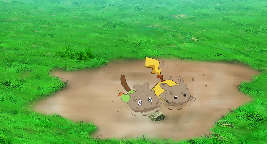 Auf dem Rückweg zum Labor landen Pikachu und Chimpep in einer kleinen Schlammpfütze. Während Ash von den beiden Pokémon ebenfalls dreckig gemacht wird, wundert sich Goh über die Schlammpfütze an dieser Stelle.