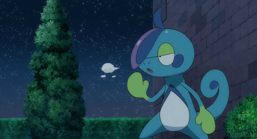 Mitten in der Nacht kommt Gohs Phlegleon aus seiner Höhle im Kirsch-Park. Es schleicht sich an den anderen, meist tief schlafenden Pokémon vorbei und landet schließlich im Garten des Labors an einer Stelle mit Blick auf den Sternenhimmel. Als es diesen betrachtet, stellt es sich Intelleon, in das es sich entwickeln will, vor. Daher beginnt es seine Aquaknarre-Attacke zu trainieren, indem es Wasserkugeln in seinen Händen bildet und diese auf den Boden schießt. Nach kurzer Zeit ist es allerdings erschöpft und legt sich auf den Boden. Daher bemerkt es nicht, wie sich hinter ihm ein unsichtbares Kecleon vorbeischleicht. Zwar schreckt es kurz durch ein vernommenes Geräusch kurz auf, da es jedoch nichts sieht, setzt es seine Pause gähnend fort.