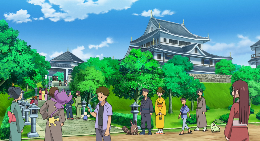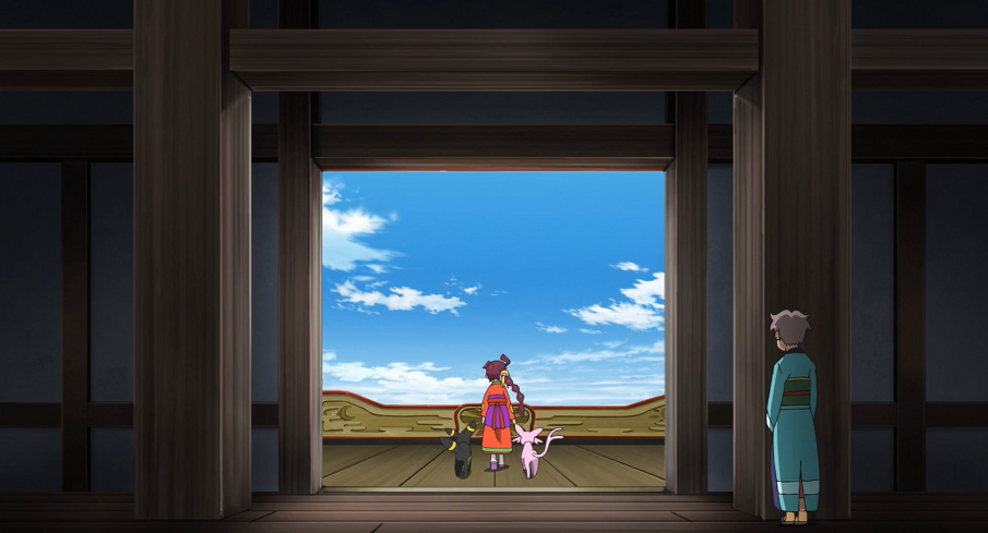 Ash und Goh erfahren derweil von einer älteren Frau, die plötzlich hinter ihnen steht, dass Psiana und Nachtara einst den Schlossherrn beschützt hätten, als dieser angegriffen worden sei. Daher seien die beiden Pokémon nun im Wappen des Schlosses zu sehen, das ganz im Zeichen der Sonnenfinsternis stehe. Die Frau stellt sich ihnen anschließend als aktuelle Schlossherrin vor. Allerdings wolle sie heute von dieser Position zurücktreten. Ash und Goh bemerken schließlich, dass Chloe und Evoli verschwunden sind.