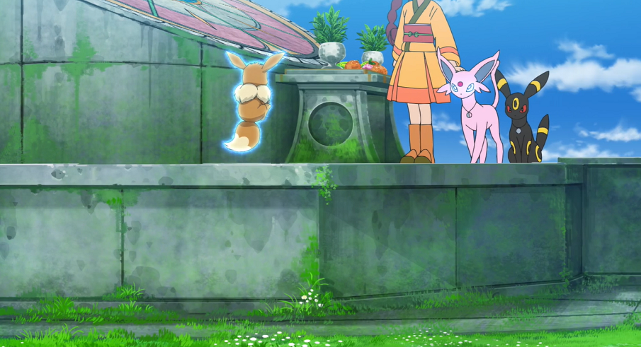 Chloe rennt ihrem Evoli durch das hohe Gras auf den Hügel hinterher. Auf diesen befindet sich nun ein Mädchen bei Psiana und Nachtara und führt eine rituelle Zeremonie durch, da sie die angehende Schlossherrin zu werden scheint. Das Psiana bemerkt durch seine Kräfte und einen Blick in die Zukunft das herbei eilende Evoli und dass es droht, wegen des hohen Grases den nahenden Abgrund zu übersehen und vom Hügel hinunterzustürzen. So kommt es dann auch tatsächlich, doch mit Hilfe seiner Psychokräfte kann Psiana Evoli in der Luft auffangen und vor dem Sturz bewahren.