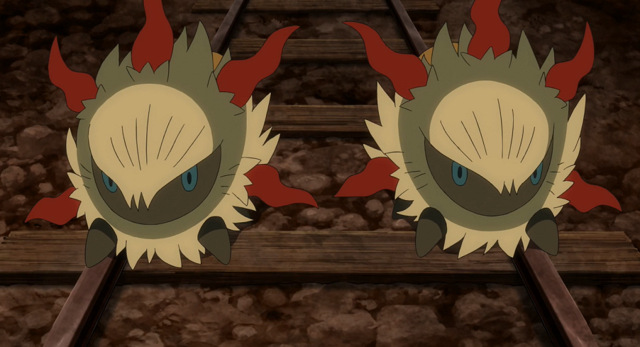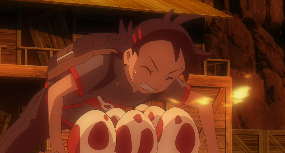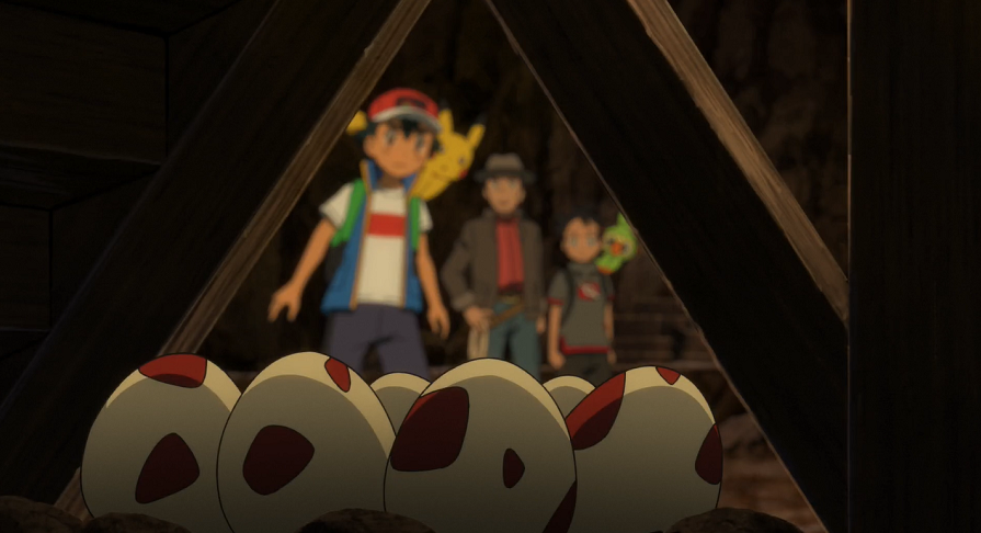 Der Mann führt sie zu einem Minen-Bahnhof, von dem man aus die nächste Mine erreichen könne. Goh wundert sich, dass der Mann sich so gut auskenne. Ash bemerkt unter der Treppe des hölzernen Bahnhof-Gestells einige weiß-rote Pokémon-Eier. Der Mann schaut sich die Eier genauer an und stellt fest, dass es sich um Ignivor-Eier handle. Ash und Goh vermuten, dass Ramoth ebenfalls in der Nähe sein müsse, um die Eier zu beschützen. Um zu verhindern, dass Ramoth dies gelingen kann, möchte der Mann deshalb die Eier schnell mitnehmen. Dazu setzt er schnell sein Voltula ein, das Ash und Goh mit Klebenetz fixiert. Der Mann gibt sich als Pokémon-Jäger zu erkennen und erklärt, dass er die Pokémon in dieser Umgebung gefangen habe, weshalb Ramoth offenbar verschwunden sei. Wenn er die Eier mitnehme und verkaufe, könne er so immerhin noch etwas Geld verdienen.