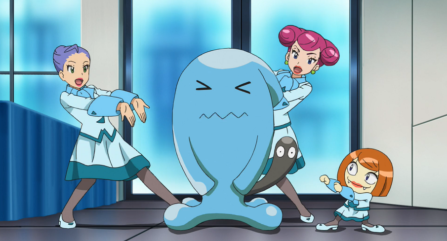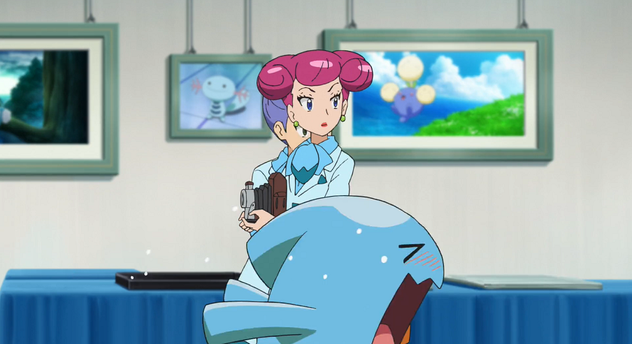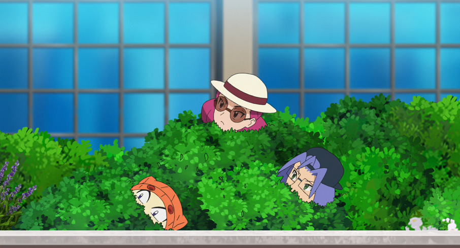 Team Rocket ist verkleidet in der Stadt unterwegs und benötigt dringend ein Erfolgserlebnis. Als sie dabei sind, sich in ihrer mittellosen Situation einen Plan zu überlegen, laufen sie direkt der Gruppe um Ash, Chloe, Goh und Goro entgegen. Schnell verstecken sie sich in einem Gebüsch und können mit anhören, wie Goro von seinem durchgetakteten Reiseplan erzählt, da er ja keine Attraktion auslassen möchte. Als erstes plant er den Besuch einer Fotoausstellung zu blauen Pokémon aus aller Welt.