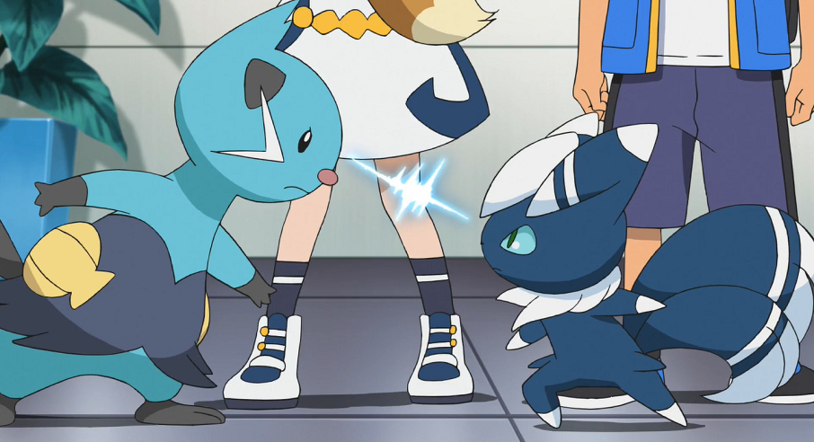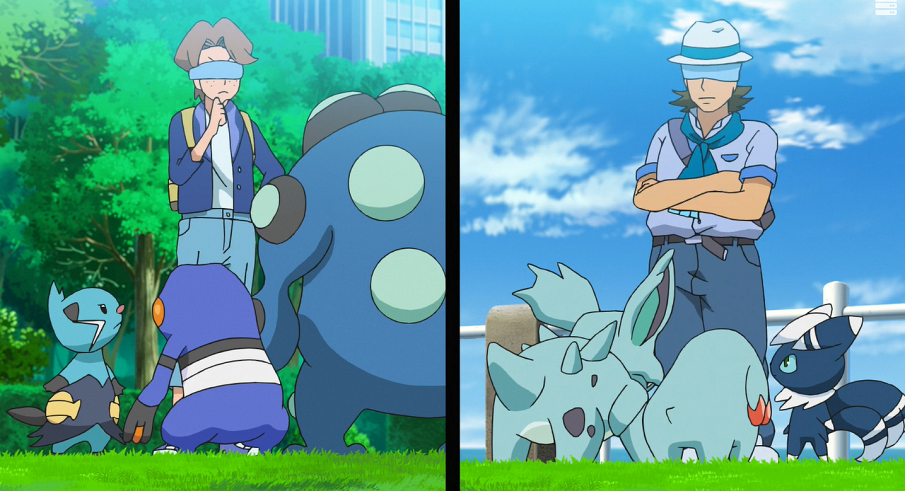Scheint es zuerst so, als würden die beiden sich in einem Doppelkampf miteinander messen, haben sie nun zur Verwunderung der Zuschauer Ash, Chloe und Goh eine Augenbinde auf. Die von Goro und Blaurin eingesetzten Pokémon — Nidorina und Phanpy bzw. Branawarz und Glibunkel — wandern jeweils zu deren Gegenüber. Diese beginnen, die Pokémon vorsichtig abzutasten, um so herauszufinden, um welches Pokémon und welches Blau es sich jeweils handelt. Beide Kontrahenten schaffen dies allerdings ohne Probleme.