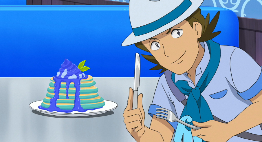 Nächstes Ziel ist ein komplett in Blau gehaltenes Café, das von einem Pokémaniac, der ebenfalls diese Farbe und blaue Pokémon favorisiert, sowie dessen Pokémon betrieben wird. Als die Gruppe die besonderen, ebenfalls im Zeichen der Farbe Blau stehenden Getränke dort probieren will, macht sich erneut Blaurin bemerkbar, der ebenfalls im Café sitzt. Er beginnt sich über Goro lustig zu machen und gibt mit einem Pfannkuchen-Gericht an, das mit besonderen blauen Beeren angerichtet worden sei, er bereits vorab bestellt habe und nun verspeisen wolle. Doch auch Goro hat einen besonderen Toast mit dem Saft blauer Beeren bestellt. Die beiden verschlingen anschließend verbissen ihr Essen, ohne es zur Verwunderung von Ash, Chloe und Goh wirklich zu genießen.