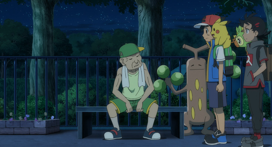 Die beiden kommen in der Stadt an, in der tiefe Nacht ist, obwohl zeitlich eigentlich Morgen wäre. Ash und Goh können beobachten, wie die Menschen dennoch versuchen, ihren normalen Tagesablauf zu leben. Dabei treffen sie auf einen älteren Mann, der gerade versucht, seinen Frühsport zu machen, jedoch, genauso wie sein Mogelbaum, ziemlich müde ist. Er berichtet ihnen, dass dieser Zustand nun bereits seit einer Woche anhalte. Neben den Auswirkungen auf den Biorhythmus mache die permanente Nacht auch den Blumen zu schaffen, die ohne das Sonnenlicht verwelken. Auch die Kramurx in der Stadt seien nicht sehr froh, da sie mit Unglück verbunden würden, wenn Menschen ihnen in der Dunkelheit begegnen. Als Goh eines davon auf einem Baum über ihnen sieht, bietet er ihm an, mit ihm zu kommen. Bereitwillig lässt sich das Unlicht-Pokémon mit einem geübten Wurf fangen. Der Mann beschließt, nach Hause zu gehen. Chimpep dagegen kann einigen der welken Blumen mit seinem Schlägel wieder Kraft verleihen. Ash und Goh können am Nachthimmel eine Sternschnuppe entdecken und genießen trotz der Umstände den schönen Sternenhimmel.