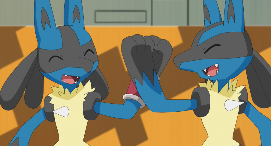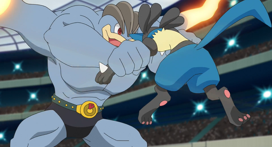 Machomei zögert ebenfalls nicht lange und legt sofort mit Patronenhieb los. Lucario kann mit Kraftwelle nicht viel gegen Machomei ausrichten und hat mit dessen vier Armen große Probleme. Schließlich schnappt sich Machomei Lucario mit zwei seiner Hände, um mit den anderen beiden einen Kreuzhieb zu landen. Danach lässt es weitere Patronenhiebe folgen und hält Lucario weiterhin fest. Ash ist verzweifelt und möchte Lucario helfen, indem er die Mega-Entwicklung einsetzt. Dazu aktiviert er seinen Schlüsselstein. Doch Lucario wehrt sich dagegen, wodurch Ashs Schlüssel-Stein wieder aufhört zu leuchten. Mit einem geschickten Kopfstoß kann sich Lucario aus Machomeis Fängen befreien. Ash versteht Lucario und erklärt ihm gegenüber, zu voreilig gehandelt zu haben.
