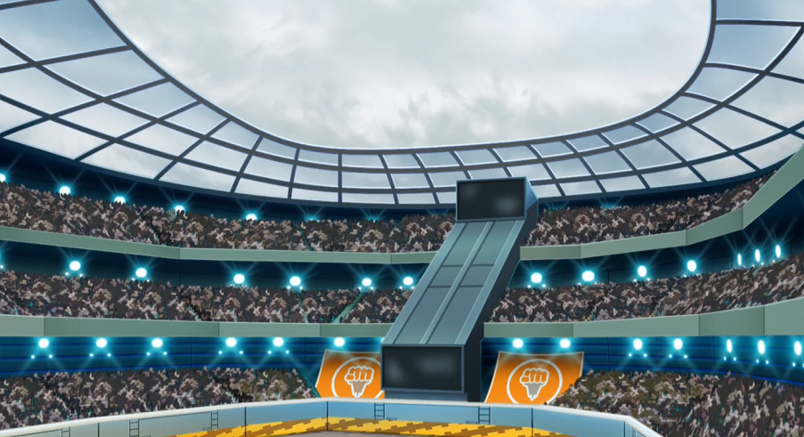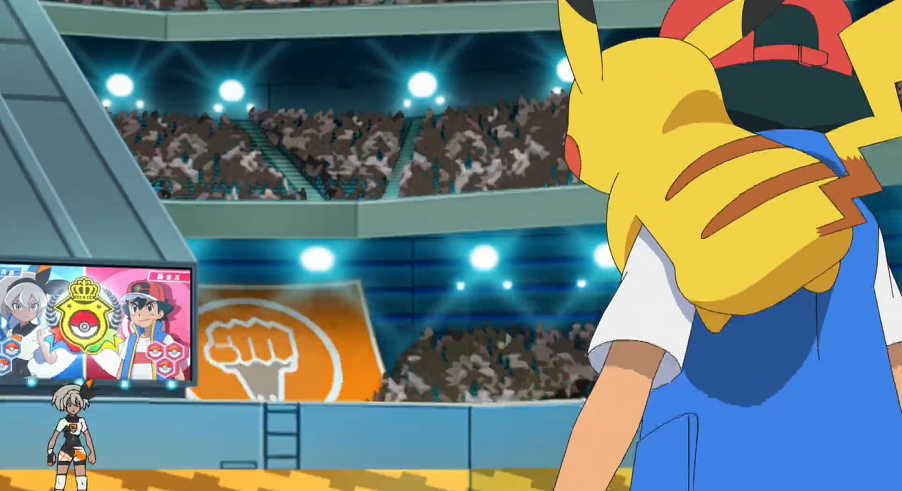 Ash, Connie, Delion, Goh, Lilia, Roy, Saida, Stadionsprecher, Zuschauer
