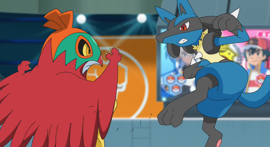 Das Kampf-Flug-Pokémon bremst das heranstürmende Lucario sogleich mit Turmkick und beginnt es mit Flügelschlag zu bearbeiten. Da auch Lucario sich mit Hieben und Tritten wehrt, kommt es zu einem rasanten Schlagabtausch, bei dem sich beide Pokémon neutralisieren. Saida weist Resladero an, Himmelsfeger einzusetzen. Lucario versucht das gegnerische Pokémon noch mit Kraftwelle aufzuhalten, doch Resladero ist bereits in der Luft, um sich spektakulär auf Lucario zu stürzen. Ashs Pokémon braucht etwas, um nach diesem Treffer wieder aufzustehen, ist dann aber entschlossen, weiterzukämpfen. Saida ruft Reladero zurück und schickt mit Machomei bereits ihr drittes Pokémon aufs Feld.