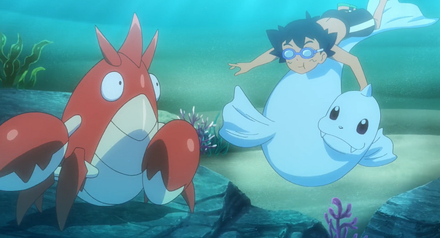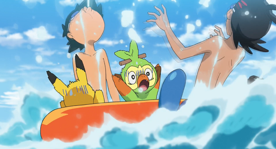 Am Strand von Graphitport City beginnen sie mit ihrem Abenteuer. Ash auf Jugong und Goh auf Mantirps begeben sich, mit Pikachu und Chimpep in einem Schlauchboot im Schlepptau, aufs Meer. Von dort setzen sie auf ihren Pokémon zum Tauchgang an. Unterwasser sehen und treffen gleich auf einige Corasonn und Liebiskus. Gohs Versuch, ein Liebiskus zu fangen, scheitert jedoch, da er unter Wasser den Pokéball nicht ordentlich werfen kann und dieser nach zur Oberfläche treibt. Kurz danach stoßen sie auf ein wildes Barschwa, das sie so sehr erschreckt, dass sie Wasser einatmen. Schnell eilen sie an die Oberfläche, wo sie wiederum Pikachu und Chimpep, die sich im Schlauchboot ausruhen, einen Schrecken einjagen.