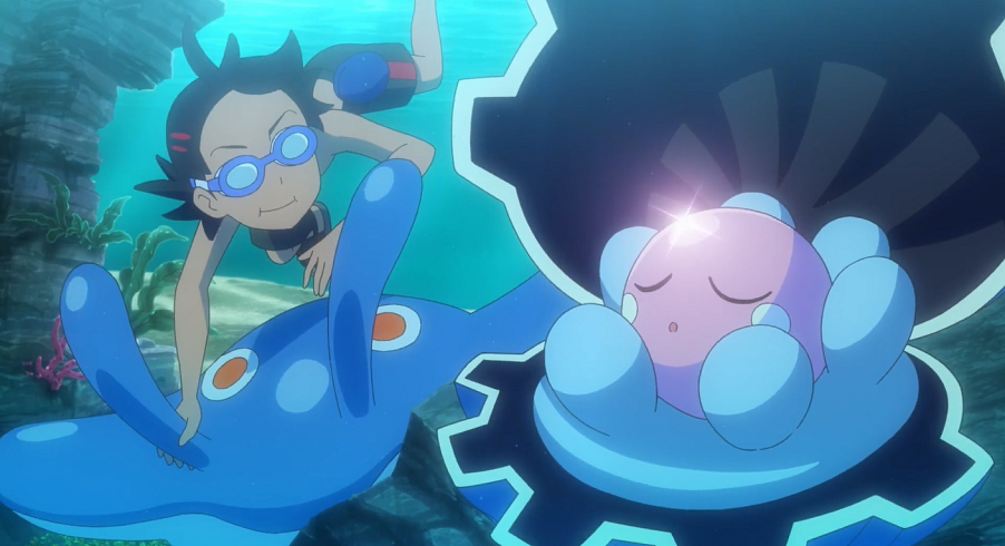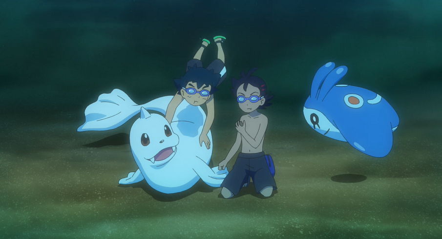 Da sie bisher nicht mal die Spur eines Seedraking oder gar Seemon gefunden haben, beschließen sie, in einem erneuten Anlauf nun etwas tiefer zu tauchen. Wieder treffen sie auf Wasser-Pokémon wie Krebscorps, Krebutack, Austos und Perlu. Auf dem Meeresboden vernimmt Goh ein Funkeln, das sich bei genauerem Betrachten als eine Scherbe herausstellt. Als beide darüber rätseln, wozu diese gehören könnte, taucht hinter ihnen ein Wailord auf, das sie mit einer Fontäne zurück an die Wasseroberfläche schießt.