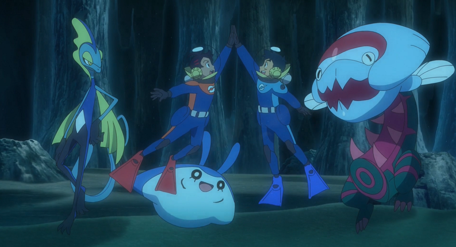 Es vergeht einige Zeit und die Sonne ist bereits am Untergehen, als Lucario einen Erfolg meldet. Dragan, der eigentlich schon aufhören wollte, wird schnell von Ash und Goh informiert. Tatsächlich sucht er auf deren Anweisung hin noch etwas weiter und kann schließlich einen Meeresgraben finden, in dem sich das gesuchte antike U-Boot findet. Dieses erinnere, so berichtet er über Funk, von der Form her an Seedraking. Da es bereits dunkel werde, sei es zu gefährlich, weiterzusuchen. Daher will er am kommenden Tag weitermachen.