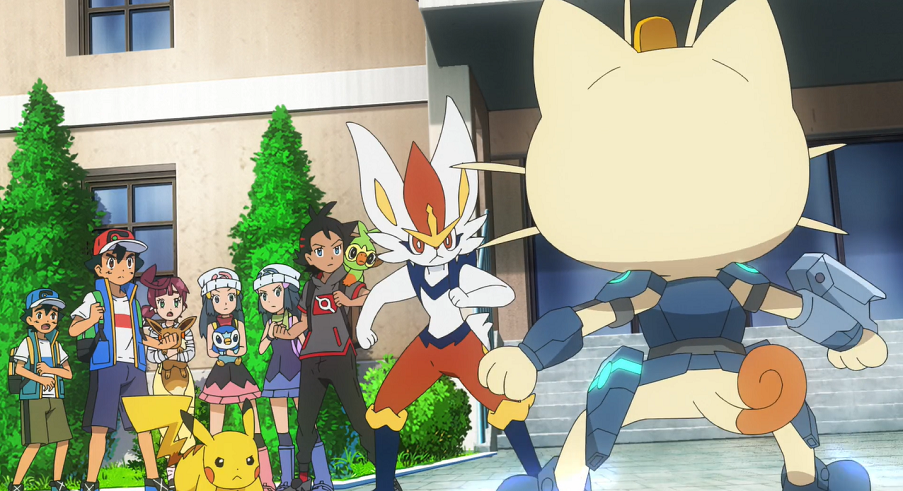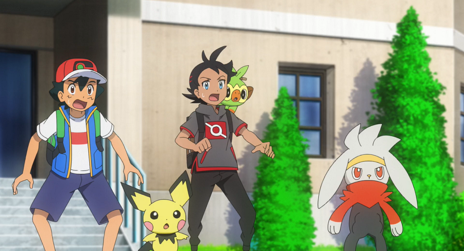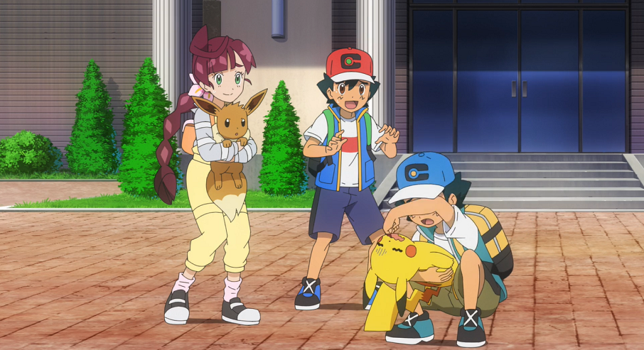 Vor dem Pokémon-Center gelandet sehen sie gleich, wie Professor Eibe das Pokémon Center eilig verlässt und zu einem LKW geht, in den eine Frau etwas verlädt. Goh kommt gemeinsam mit Lucia und der anderen Lucia aus dem Pokémon-Center gerannt, um Professor Eibe noch zu erreichen. Dabei erblickt er Ash und Chloe. Gemeinsam können sie beobachten, wie ein zweiter Professor Eibe in einem Auto herbeigefahren kommt, aus diesem aussteigt und den anderen Professor Eibe zur Rede stellt, der gerade mit der Frau verschwinden will. Der falsche Professor Eibe und die Frau lassen ihre Maske fallen und geben sich als James und Jessie aus dieser Welt zu erkennen. Goh erläutert, dass die beiden demnach versucht hätten, die Pokémon aus dem Pokémon-Center zu stehlen. Ash und Goh schicken Pikachu und Liberlo in den Kampf, während ihnen Mauzi entgegentritt. Jessie, James und Woigenau machen sich mit dem Gefährt aus dem Staub. Als Pikachu und Liberlo angreifen wollen, beginnen sie jedoch auf einmal und zum Erstaunen ihrer Trainer sich zu Pichu und Kickerlo zurückzuentwickeln. Mauzi kann sich so ebenfalls aus dem Staub machen. Der andere Ash rät allen, ihre Pokémon in ihre Pokébälle zurückzuziehen, um so zu versuchen, sie vor dem Effekt zu schützen. Chloe, Goh und Lucia folgen diesem Rat, während Ash Pichu nur in seiner Westentasche verstauen kann. Goh befürchtet, dass ihre Pokémon bald ebenfalls zu Eiern werden. Professor Eibe stimmt mit ein und erläutert, dass dies nicht nur Pokémon und Pflanzen betreffe, sondern auch die Menschen. Chloe und Goh vermuten, dass neben Palkia, dem Herrscher des Raumes, auch Dialga aufgrund des Durcheinanders in der Zeit beteiligt sein könnte. Professor Eibe erläutert ihnen, dass sie diese wohl bei der Speersäule auf dem Kraterberg antreffen könnten. Ash und Goh erhoffen sich, dass beide die Verzerrungen wieder beheben und die bestehenden Probleme rückgängig machen können. Professor Eibe hält es für möglich, dass ihnen diese Mission gelingen kann.