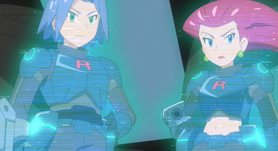 Ash will die beiden vom Kämpfen abhalten, doch im selben Moment gibt sich das andere Team Rocket zu erkennen, das Verstärkung in Form von Rüpeln mitgebracht hat. Angeführt von Mauzi schicken diese ihre Pokémon, die wie ihre Trainer ebenfalls einen Schutzantrag tragen, in den Kampf. Ash und Goh setzen Alpollo und Dragonir sowie Aerodactyl und Libelldra ein und erhoffen sich, ihre gestohlenen Pokémon Lucario und Intelleon befreien zu können, müssen allerdings mit ansehen, wie sich diese sofort über die restlichen Zwischenstufen zurück in Eier verwandeln. Woingenau nutzt den fehlenden Schutz der vier aus, um sie zu fesseln. Team Rocket zeigt ihnen Lucario und Intelleon, die sich hinter ihnen, zusammen mit anderen gestohlenen Pokémon in einem Käfig befinden, und sich nun ebenfalls zu Riolu und Phlegleon zurückentwickeln. Die andere Jessie und der andere James erklären, dass Team Rocket hinter den Geschehnissen stecke und es ihnen gelungen sei, mit der Roten Kette, die Dialga und Palkia gefangen hält, und der dahinterliegenden Kraft von Arceus, die beiden Pokémon zu einem gemeinsamen Kampf zu bringen. Die dadurch ausgelösten Verzerrungen in Raum und Zeit sollten Team Rocket helfen, die zurückverwandelten Pokémon und Pokémon-Eier einfacher zu stehlen. Anschließend planen sie, die vom Kampf angeschlagenen Dialga und Palkia zu fangen, um dann die Verzerrungen aufzuheben und die wieder in ihre ursprüngliche Form gebrachten Pokémon für ihre Zwecke einzusetzen und so die Weltherrschaft zu übernehmen. Ash, Goh, Chloe und Lucia wollen Team Rocket aufhalten, was ihnen jedoch aufgrund ihrer Fesseln und der fehlenden Pokémon nicht möglich ist. Hinter ihnen tauchen jedoch, zu ihrer Verwunderung, ihre anderen Versionen aus der alternativen Welt auf, um ihnen zu helfen. Mit Feuerodem schafft es das Libelldra des anderen Gohs mühelos, die Gruppe von ihrer Fessel zu befreien. Ash und Goh erläutern dem anderen Goh, dass sie planen, die Rote Kette um Dialga und Palkia aufzubrechen, um so wieder für Normalität zu sorgen. Während sich Ash mit Pichu und der andere Ash auf dem Libelldra des anderen Gohs auf den Weg machen und versuchen, die beiden Legendären Pokémon zu befreien, stellt sich der Rest Team Rocket entgegen und setzt dabei seine Pokémon ein. Während das Liberlo und das Evoli des anderen Goh und der anderen Chloe einen Schutzanzug tragen, ist bei Gohs Kickerlo, Chloes Evoli sowie bei Plinfa und Haspiror der beiden Lucias kein Schutz nicht gegeben. Sofort entwickelt sich Gohs Kickerlo daher zu Hopplo zurück.