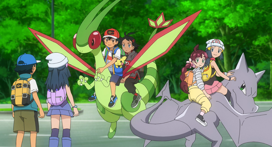 Um zur Speersäule zu kommen, ruft Ash erneut Dragoran und Gengar aus ihren Pokébällen. Sofort entwickeln sich diese jedoch zu Dragonir und Alpollo zurück. Ash zieht die beiden schnell zurück in ihre Pokébälle und Goh setzt stattdessen Aerodactyl und Libelldra ein. Da beide nicht genug Platz bieten, wollen die andere Lucia und der andere Ash nachkommen, während Ash, Goh, Chloe und Lucia sich direkt auf Gohs Pokémon zur Speersäule aufmachen.
