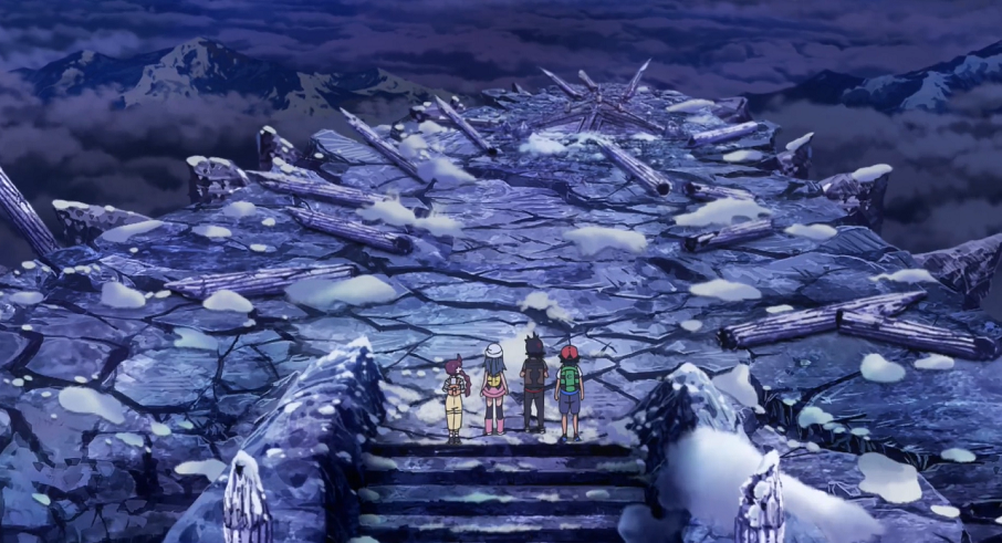 Ash, Goh, Chloe und Lucia sind auf dem Kraterberg bei der Speersäule angekommen. Als Ash nach den beiden ruft, bemerkt Pichu neben ihnen ein Tor, das in eine andere Welt zu führen scheint, wo sie Dialga und Palkia vermuten. Sie beschließen, durch das Tor zu gehen.
