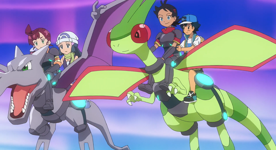 Zeitgleich suchen der andere Ash und die andere Lucia per Smart-Rotom nach einer Gelegenheit, um zum Kraterberg zu kommen. Auf einmal kommen die alternativen Versionen von Chloe und Goh aus dieser Welt auf Aerodactyl und Libelldra angeflogen und wollen sie zum Kraterberg bringen. Sie tragen, wie ihre Pokémon, dieselben Schutzanzüge wie das andere Team Rocket und erklären ihnen während des Flugs, dass sie herausgefunden hätten, dass diese Anzüge sie und ihre Pokémon vor den Einflüssen der Zeiteffekte schützen.