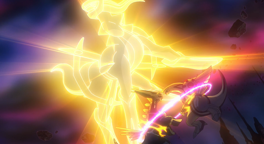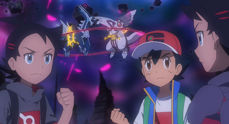 Die echten Ash, Goh, Chloe und Lucia landen tatsächlich an dem Ort, an dem sich Dialga und Palkia befinden. Allerdings scheinen diese eng beieinander gefangen zu sein. Beide kämpfen miteinander, wobei immer wieder Energie von Palkia freigesetzt wird, die Tore öffnet. Aus diesen entweicht dann wiederum von Dialga freigesetzte Energie und scheint auf der anderen Seite der Tore für die Verzerrungen in der Zeit zu sorgen.