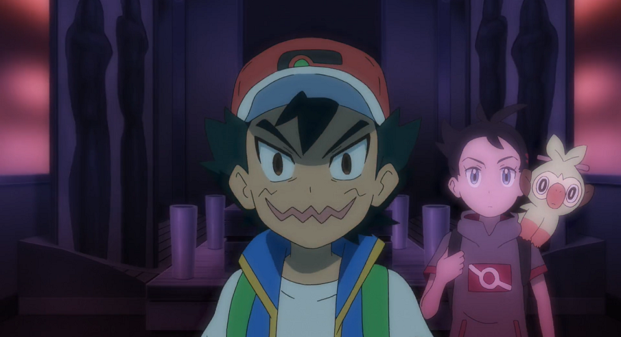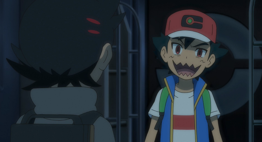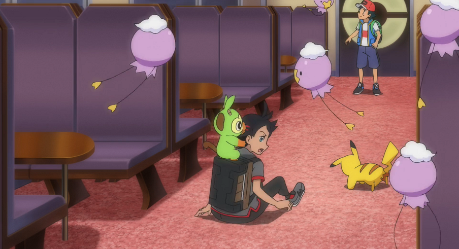 Nach der Abfahrt registriert Goh erst den Namen des Zuges, den er zuvor in der Durchsage vernommen hat. Ash sieht darin kein Problem, solange er nach Passbeck fahre. Von dem Ticket, das der Junge hat fallen lassen, entnehmen sie, dass er seinen Platz im Wagen mit der Nummer 1 und damit ganz am Anfang des Zuges habe. Die beiden wollen zu diesem Wagen gehen, um das Ticket zurückzubringen. Im ersten Wagen auf ihrem Weg dorthin finden sie einen großen Raum vor, in dessen Mitte ein Stein auf einem kleinen Podest ausgestellt ist, der an einen Spiritkern erinnert. Ash mustert den Stein etwas genauer, wobei ihm das herumalbernde Chimpep auf den Hinterkopf springt. Dadurch stößt Ash mit seinem Kopf gegen den Stein, der daraufhin auf den Boden fällt. Ash ist froh, dass der Stein nicht beschädigt zu sein scheint und will ihn aufheben, scheitert jedoch an dessen enormen Gewicht. Auch gemeinsam mit Goh kann er den Stein nicht anheben. Als Ash ein paar mal auf den Stein klopft, beginnt dieser zu leuchten und es ist zu sehen, wie aus diesem ein Licht über Ashs Arm hindurch in seinen Rumpf wandert. Goh und Pikachu sind kurz irritiert, doch Ash scheint sich normal zu verhalten und möchte weiter nach dem Jungen suchen. Als sie weitergehen, beginnt der Stein rötlich zu leuchten und der vorangehende Ash zieht eine gespenstische Grimasse. Plötzlich beginnt das Licht zu flackern und Goh meint, etwas durch die Tür im Wagen vor ihnen gesehen zu haben. Ash beginnt nun, sobald das Licht weg ist, sich anders zu verhalten und eine gespenstische Mimik anzunehmen. Er drängt und stößt Goh schließlich in den nächsten Wagen, nimmt aber immer wieder sein normales Ich an, sobald das Licht kurz angeht. Um sie herum tauchen nun einige Driftlon auf. Aufgrund der Informationen, die Gohs Smart-Rotom ausgibt, dass diese Kinder ins Jenseits ziehen würden, bekommt Goh noch mehr Angst. Der gespenstische Ash schnappt sich einige der Driftlon und beginnt, Goh durch den Raum zu jagen. Als sie schließlich so im nächsten Wagen landen und Ash die Driftlon loslässt, fängt er an, über Goh zu lachen. Der echte Ash im Inneren von Ashs Körper bedauert, wie er sich gegenüber Goh verhält. Er bemerkt, wie ein kugelrundes grünes Licht neben ihm umherschwirrt.