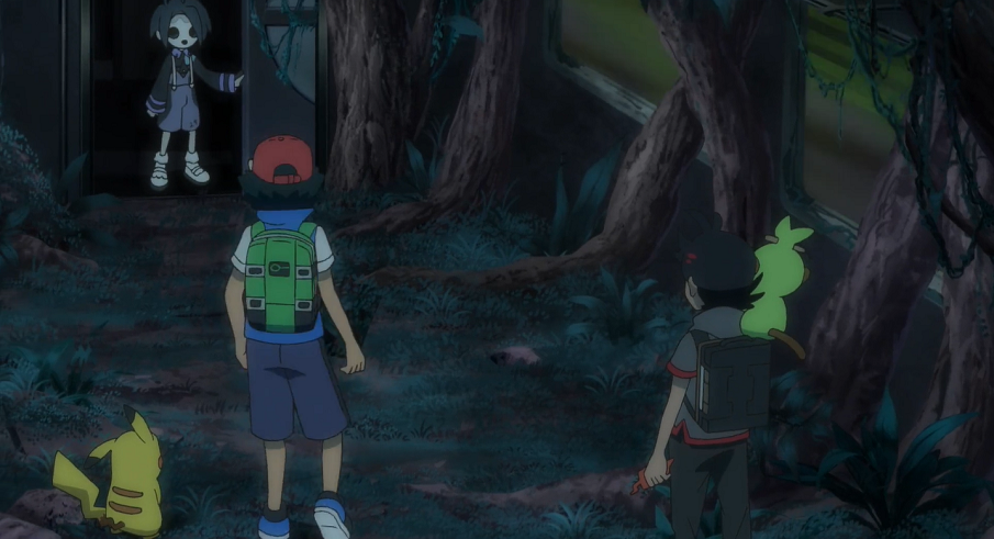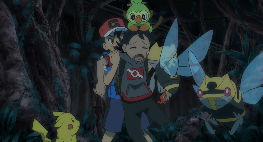 Der Zug fährt weiter und Goh erreicht mit Pikachu, Chimpep und Ash, der sich weiterhin merkwürdig verhält, den nächsten Wagen. Dort erwartet sie eine waldähnliche Szene. Inmitten des Raumes befinden sich einige Irrbis. Ash zieht Goh auf, dass dieser Angst habe und sich nicht trauen würde, zuerst weiterzugehen. Er bietet Goh an, durch eine Runde Schere-Stein-Papier zu entscheiden, wer vorangehe. Ash allerdings betrügt, indem er seine Wahl erst spielt, nachdem Goh seine schon festgelegt und gezeigt hatte. Goh ist sauer und auch Pikachu ist von diesem Verhalten enttäuscht. Ash lässt nicht locker und will, dass Goh zuerst geht. Beide bemerken, wie hinter einer Baumwurzel ein Zobiris auftaucht, über dessen Schatten sich Goh kurz erschrocken hat. Schadenfroh kommentiert Ash daraufhin, wie aus dem Boden einige Nincada auftauchen. Diese beginnen auch umgehend sich zu Ninjask zu entwickeln. Ash schnappt sich daraufhin Goh und hält ihn so fest, dass die Ninjask ihm Bodychecks verpassen können, indem sie ihn anfliegen. Pikachu hat nun genug gesehen und verpasst Ash sowie allen anderen einen kräftigen Donnerblitz. Dadurch werden die Ninjask durch die kaputt gehenden Fenster aus dem Zug gejagt. Auch Ash und Goh landen erst einmal auf dem Boden, werden jedoch schnell wieder aufgeschreckt, als Gohs Smart-Rotom vermeldet, dieser habe erfolgreich ein Ninjatom gefangen. Dieses sei durch die Entwicklung eines Ninjask in einem Pokéball bei Goh aufgetaucht.