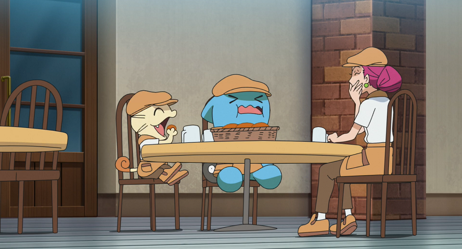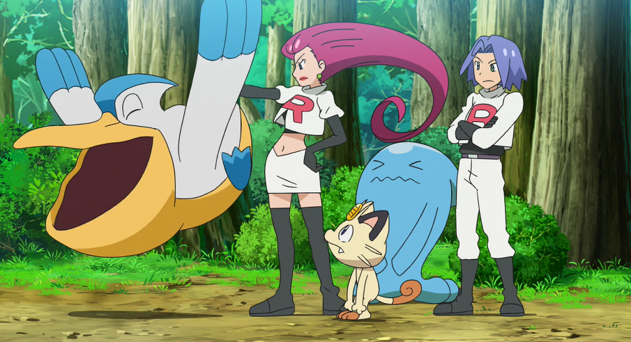Als sie sich zu einer kleinen Pause mit ihrem Proviant nach draußen begeben, ist Team Rocket nach der vielen erfolgreich erledigten Arbeit sehr zufrieden. Auf einmal sehen sie Pelipper, das an ihnen vorbeifliegt und ihnen kommt wieder in den Sinn, weshalb sie eigentlich hier sind. Jessie möchte sofort die Verfolgung aufnehmen und meint, sie hätten sich genug bei Cassidy für ihre Hilfe revanchiert. James hingegen möchte nicht Hals über Kopf und ohne sich zu verabschieden einfach so gehen. Jessie bietet James an, hier zu bleiben, da er sehr glücklich wirke. Mauzi berichtet, dass es James noch nie so glücklich gesehen habe, als dieser gemeinsam mit Cassidy und Rattikarl einen seiner Lieblingskronkorken in Holz nachgeschnitzt habe. Alle legen daraufhin nochmals ihre Hände zusammen, ehe Jessie, Mauzi und Woingenau traurig davonlaufen, um Pelipper zu folgen, und James zurücklassen.