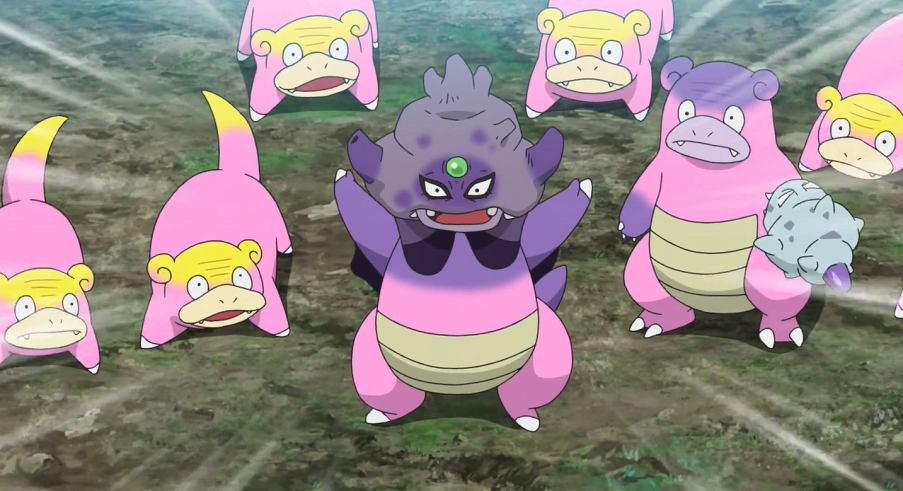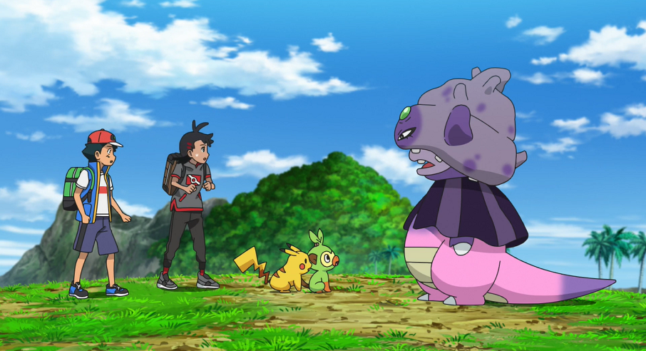 Ash und Goh, welche die Szene beobachtet haben, werden auf einmal durch einen lauten Schrei aufgeschreckt. Sie folgen dem Galar-Lahmus und finden schließlich zwei sich gegenüberstehende Gruppen vor: auf der einen Seite die normalen Flegmon sowie das Lahmus, auf der anderen Seite die Galar-Flegmon und Galar-Lahmus, zu denen auch noch ein Galar-Laschoking stößt. Nachdem sich Ash und Goh über ihr Smart-Rotom informiert und erfahren haben, dass dieses eigentlich von Muschas' Verstand kontrolliert werde, können sie beobachten, wie das Galar-Laschoking plötzlich damit beginnt, etwas vor sich hinzumurmeln. Mit Hilfe von Psychokinese bewegt es so einen Berg von Früchten von deren Insel zu sich. Mit den über ihm schwebenden Früchten läuft es dann auf die andere Gruppe zu, die jedoch bereits den Rückzug angetreten hat. Die Galar-Pokémon machen sich verdutzt nun ebenfalls auf den Weg zurück zu ihrer Insel.