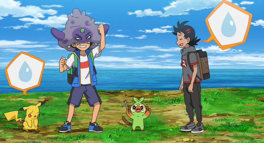 Galar-Laschoking bringt mit Hilfe seiner Psychokinese die Insel der Galar-Flegmon zum Schweben, auf der die Galar-Pokémon dann zur Rückreise ansetzen. Fröhlich winken sich die beiden Gruppen zum Abschied zu. Ash, Goh, Pikachu und Chimpep hoffen, die Galar-Pokémon eines Tages wieder zu treffen.