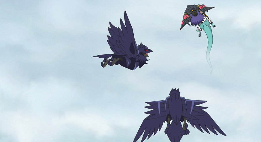 Delion erkennt nun ebenfalls das Problem. Er verbindet Meikros verletzten Flügel. Ash setzt es danach auf die Schulter eines der Krarmor, die gemeinsam mit den anderen Meikro davon fliegen.