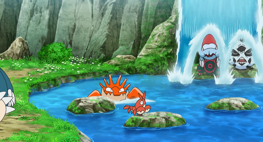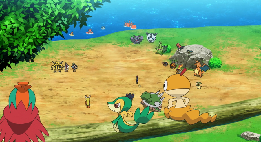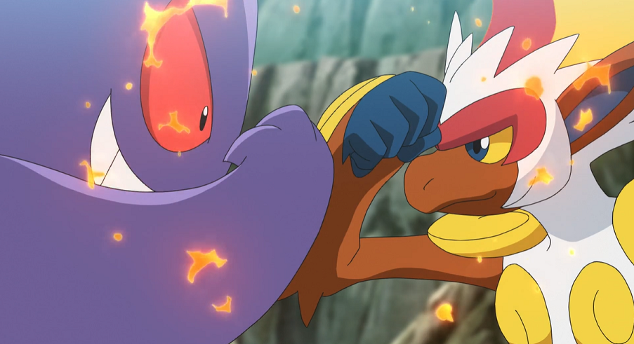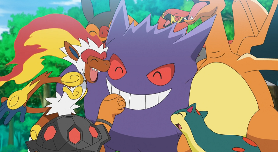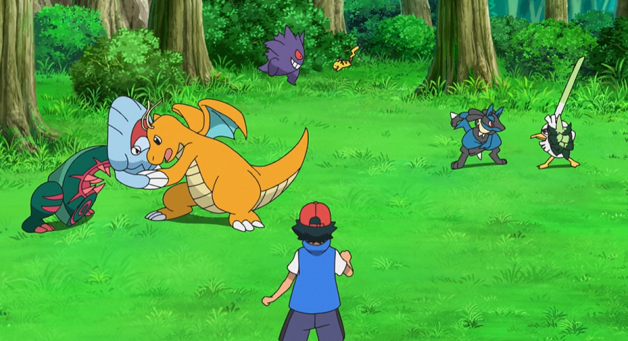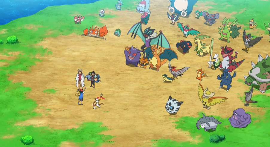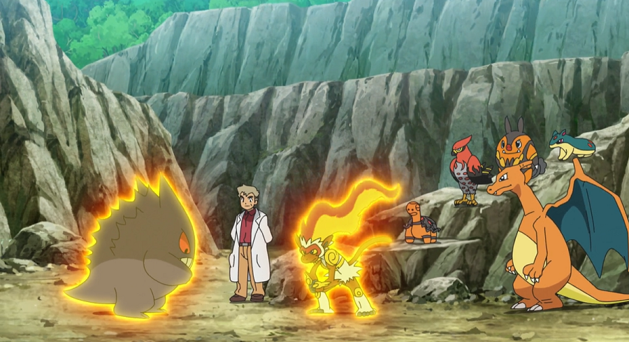 Gengar übt fleißig, unter Beobachtung von Professor Eich, mit Ashs Panferno und den anderen Feuer-Pokémon und ist so dabei, eine neue Attacke zu erlernen. Lauchzelot, Lucario, Dragoran sowie Pescragon sind ebenfalls fleißig in jeweils kleinen Gruppen zusammen mit Ashs anderen Pokémon am Trainieren.