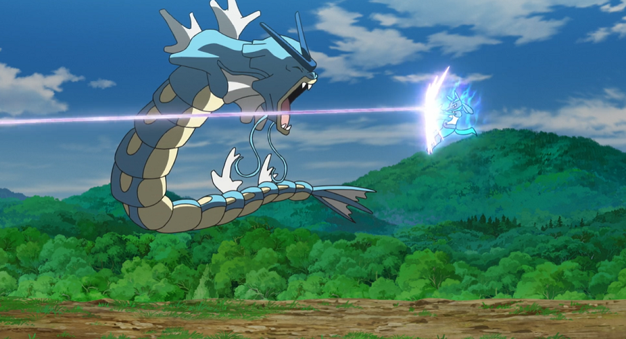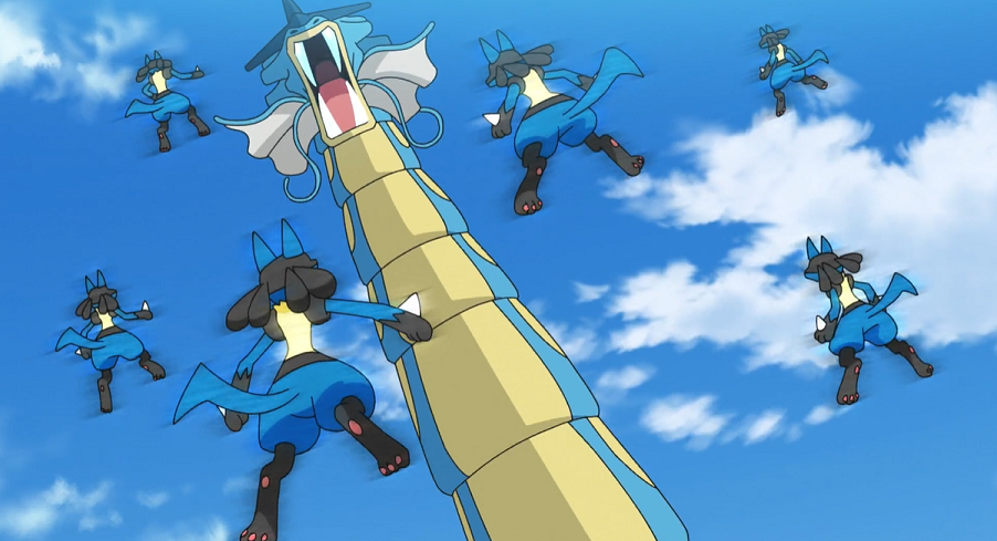 Zum Trainingskampf haben sich alle von Ashs Pokémon sowie Goh und Professor Eich versammelt. Der Kampf beginnt. Ash schickt als erstes Pokémon Lucario in den Kampf, Paul entscheidet sich für Garados. Lucario startet mit Doppelteam. So gelingt es Garados nicht, das richtige Lucario mit seiner Eiszahn-Attacke zu erwischen. Daher lässt Pauls Pokémon Hyperstrahl folgen und dreht sich dabei einmal um sich selbst, jedoch erneut ohne Lucario zu erwischen. Dieses möchte Garados' kurze Ruhepause nach dem Hyperstrahl nutzen, um mit Aurasphäre einen Treffer zu landen. Doch Garados ist schneller als gedacht wieder einsatzfähig und kann Lucario gerade noch rechtzeitig mit seinem Schwanz erwischen und umwickeln. So ist Lucario der folgenden Eiszahn-Attacke schutzlos ausgeliefert, kann sich danach aber mit Stahlstrahl befreien. Lucario umgibt nun ein bläuliches Leuchten und es beginnt, die neu erlernte Attacke Patronenhieb vorzubereiten. Garados setzt gleichzeitig zu einem weiteren Hyperstrahl an. Allerdings ist Lucarios Patronenhieb schneller, weshalb es Garados besiegen und dem Hyperstrahl ausweichen kann. Auf Nachfrage des erstaunten Goh erklärt Professor Eich, dass Lucario durch die enge Kampfsituation in der Lage gewesen sei, seine Stahlkräfte zu aktivieren und schließlich Patronenhieb einzusetzen.
