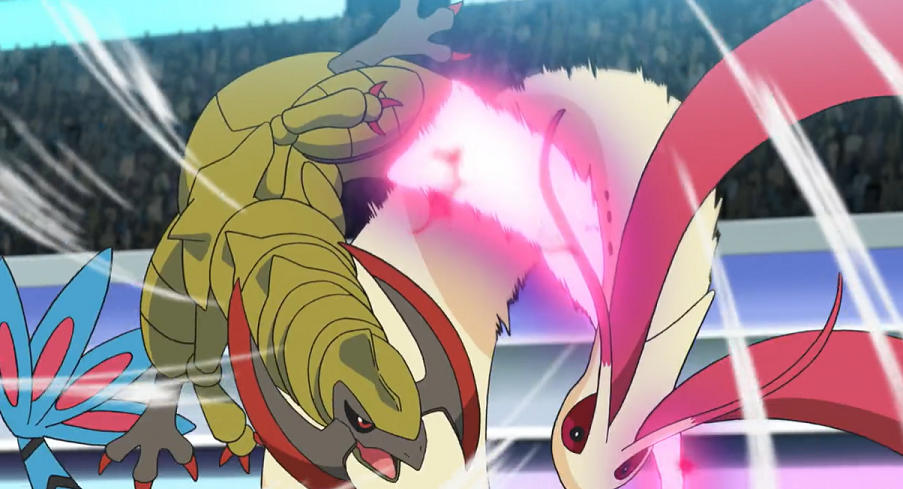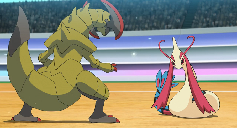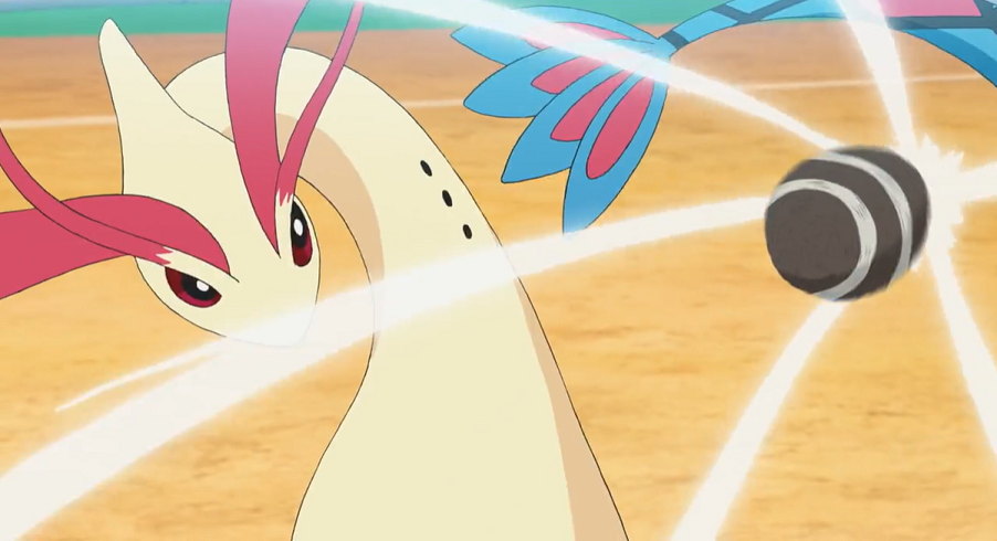 Auf der Tribüne sind Ash und die anderen beeindruckt von Milotics Stärke.