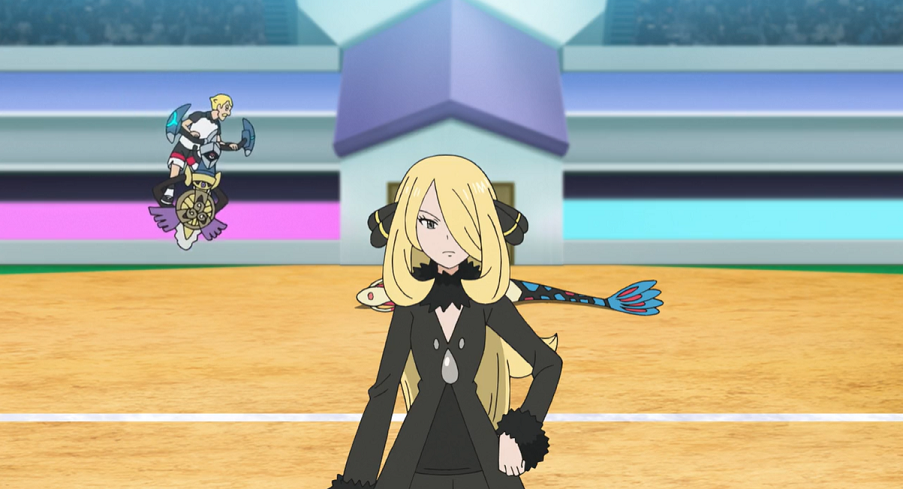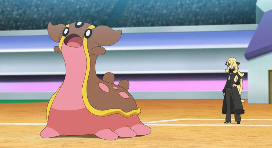 Gastrodon lässt Lehmbrühe folgen. Stalobor versucht mit Fokusstoß zu kontern, wird jedoch durch Gastrodons Attacke, die durch das Regenwetter noch verstärkt wird, gebremst und nimmt ordentlichen Schaden. Cynthia erwidert nun, sich von Lilia nicht aufhalten lassen und ihren Weg gehen zu wollen. Gastrodon erhöht mit Säurepanzer seine Verteidigung, wodurch es Stalobors Schlagbohrer-Angriff schadlos überstehen kann. Erneut setzt Gastrodon Lehmbrühe ein und nimmt Stalobor in dem braun-wirbelnden Wasser gefangen. Lilia weiß sich und ihrem Pokémon nicht anders zu helfen, als ihre Hoffnung in eine letzte Attacke zu setzen: Stalobor setzt daraufhin Hornbohrer ein, springt aus dem Wasser in die Luft und stürzt sich auf Gastrodon. Erfolgreich, denn Cynthias Pokémon wird von der K.O.-Attacke getroffen und besiegt. Dadurch endet auch der Regen.