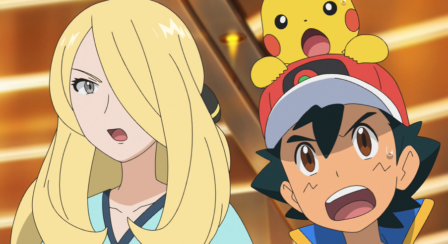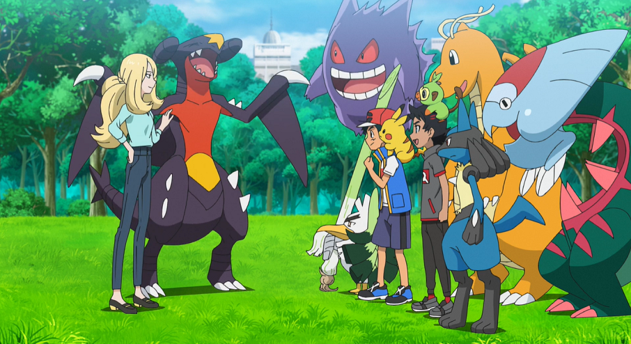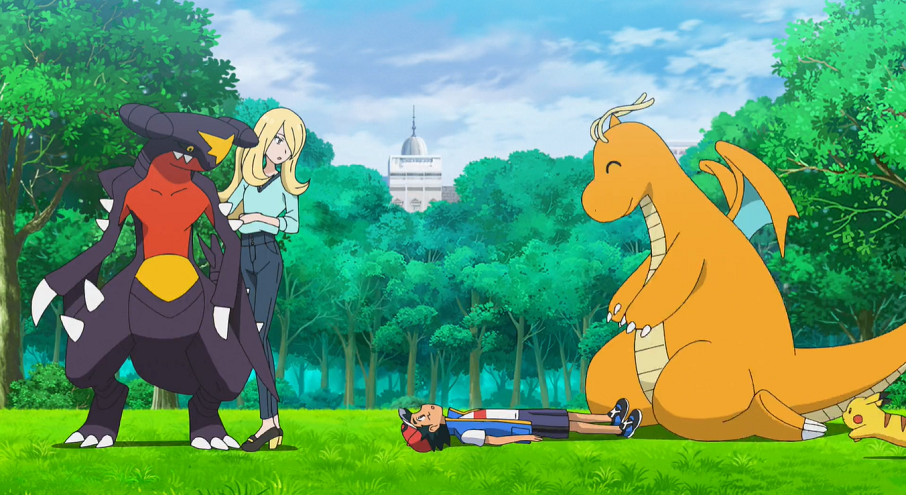 Nach einem kurzen Aufwärmen auf einer Wiese mit seinen Pokémon ist Ash für den anstehenden Kampf optimistisch, alle seine Pokémon wirken sehr motiviert. Dragoran bringt seine Freude dadurch zum Ausdruck, dass es sich direkt auf Ash stürzt, wodurch dieser zu Boden gerissen wird und durch Dragorans Schwung gemeinsam mit seinem Pokémon durch ein Gebüsch rutscht. Auf der anderen Seite dieses Gebüschs kümmert sich gerade Cynthia um ihr Knakrack, die sehr erstaunt darüber ist, Ash und Dragoran so unvermittelt zu begegnen. Ash bestätigt ihre Vermutung, dass er sich ebenfalls in den letzten Vorbereitungen auf den Kampf befinde. Cynthia und ihr Knakrack geben Ash, dessen Pokémon sowie Goh eine kleine Vorführung von Knakracks Flugkünsten. Ebenso werden sie Zeuge, wie Cynthia als Teil ihrer Routine vor Kämpfen ihr Knakrack massiert, womit sie dessen Muskulatur unterstützt. Bei seinem anschließenden weiteren Flugversuch wirkt Knakrack dadurch schneller.