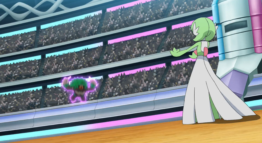 Dianthas Guardevoir attackiert Gortrom mit Spukball. Dieses kann ausweichen und kontert mit Abschlag, doch auch Guardevoir kann geschickt dem Gegenangriff entgehen und setzt wiederum Psychokinese ein. Damit bewegt es das Pflanzen-Pokémon in die Luft, um es dann auf den Boden fallen zu lassen, wodurch es besiegt wird.