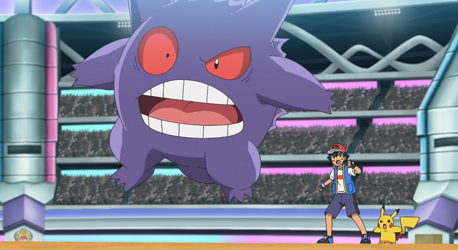 Bevor Ash mit Gengar sein nächstes Pokémon in den Kampf schicken kann, ruft Cynthia ihr Kryppuk zurück und tauscht es gegen Roserade aus. Dieses startet mit Kugelsaat gegen Ashs Gengar, was diesem jedoch nicht viel ausmacht. Gengars Spukball kann Roserade jedoch abwehren. Gengars folgende Irrlicht-Attacke will Roserade mit Blättersturm kontern. Schließlich treffen die Attacken jeweils den Gegner, sodass Roserade eine Verbrennung erleidet und Gengar Schaden nimmt. Zur erneuten Überraschung von Ash ruft Cynthia nun, um die Kontrolle nicht Ash zu überlassen, auch Roserade wieder zurück und entscheidet sich erneut für Kryppuk. Gengar will Kryppuk mit einer Zauberschein-Attacke begrüßen, doch Cynthias Pokémon setzt erneut zuerst Tiefschlag ein, sodass beide Pokémon jeweils sehr effektive Treffer einstecken müssen. Während Kryppuk wieder sich wieder aufrichten kann, hat Gengar schon schwerer zu kämpfen. Mit Mühe kann Ashs Pokémon wieder aufstehen, um dann doch kampfunfähig erneut zu Boden zu gehen. Ash und Pikachu sind ernüchtert über den bisherigen Kampfverlauf.