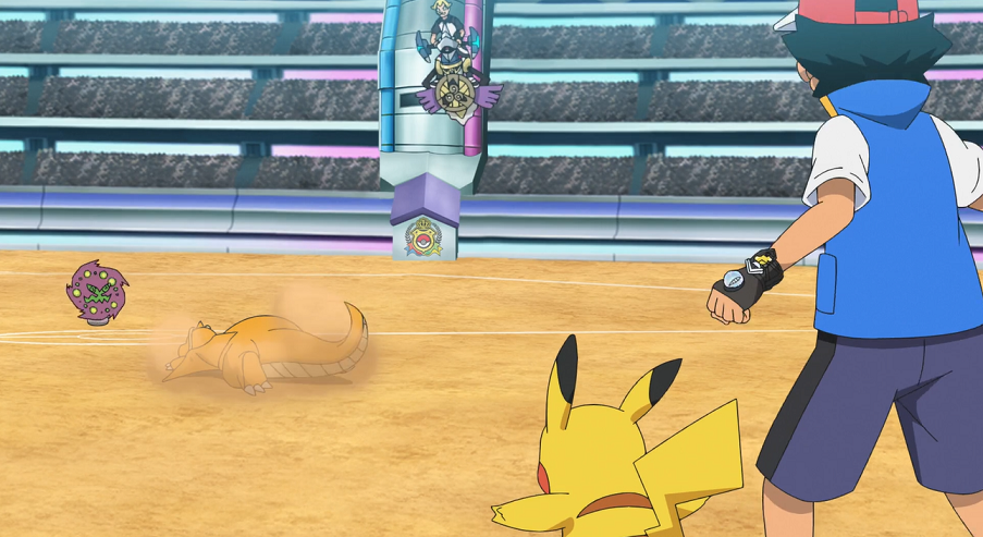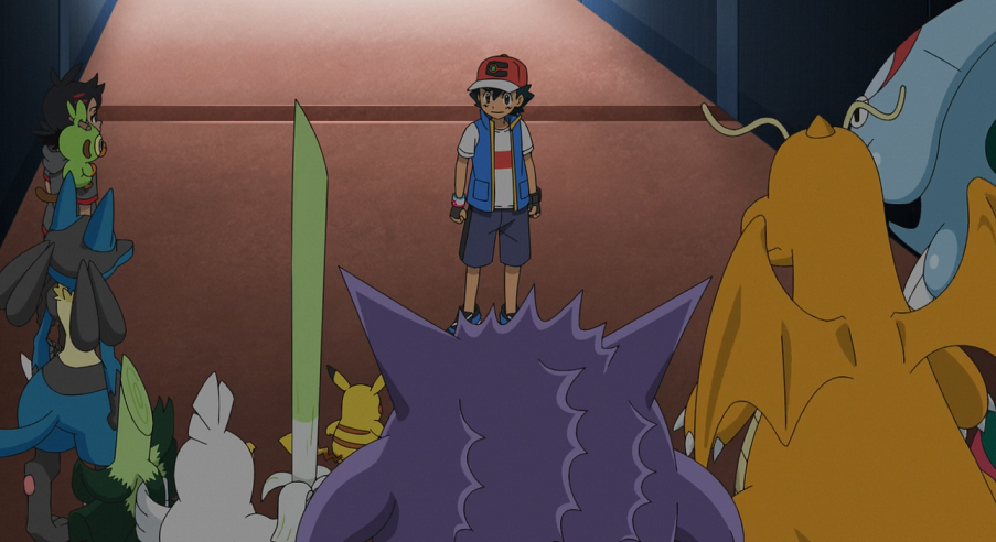 Im Tunnelgang zum Kampffeld schwört sich Ash mit seinen Pokémon Pikachu, Gengar, Dragoran, Lucario, Lauchzelot und Pescragon auf den Kampf ein. Auch Goh ist dabei und wünscht ihm für den Kampf alles Gute.
