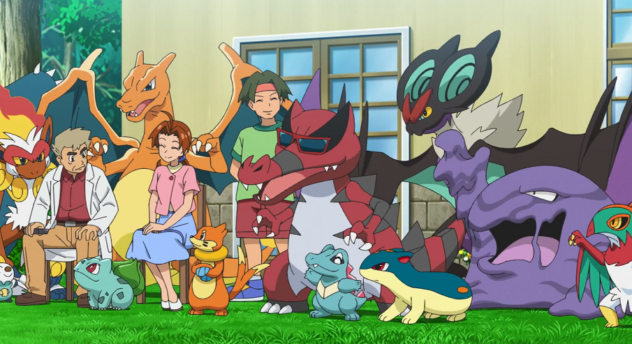 Im Labor von Professor Eich hat sich dieser gemeinsam mit Tracey, Ashs Mutter sowie Ashs Pokémon im Garten vor dem Fernseher versammelt, um den Kampf zu verfolgen.