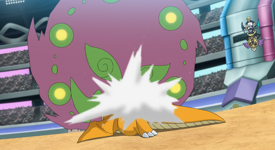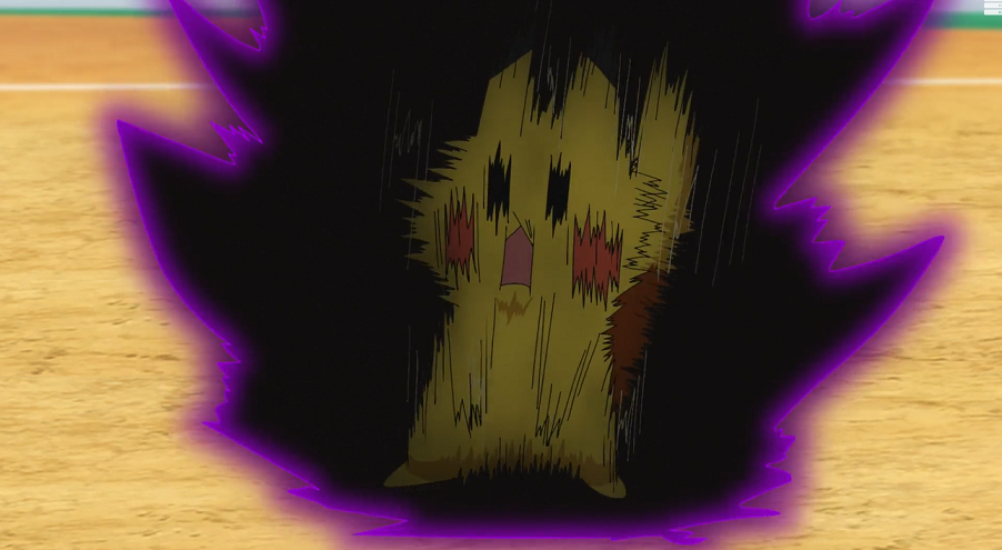Pikachu will Kryppuk nun mit Elektronetz gefangen nehmen. Dieses versucht wieder mit Tiefschlag zu kontern, doch Pikachu weicht ihm flink aus und kann erfolgreich das Elektronetz setzen. Danach attackiert es Kryppuk mit Eisenschweif. Dieses antwortet noch mit einer Attacke, ohne Pikachu jedoch zu schaden oder dessen Angriff zu unterbinden. So wird Kryppuk durch die Eisenschweif-Attacke besiegt. Sowohl Ash als auch Pikachu sowie auch das Publikum beginnen zu jubeln. Während der Kampfrichter Kryppuk untersucht, tritt aus dessen Spiritkern dunkle Energie, die sich in Richtung Pikachu bewegt, dieses umgibt, ihm Schaden zufügt und es so, zur Überraschung aller, besiegt. Der Stadionsprecher stellt fest, dass Kryppuk zuvor noch Abgangsbund eingesetzt habe, wodurch Pikachu nun ebenfalls kampfunfähig geworden sei.