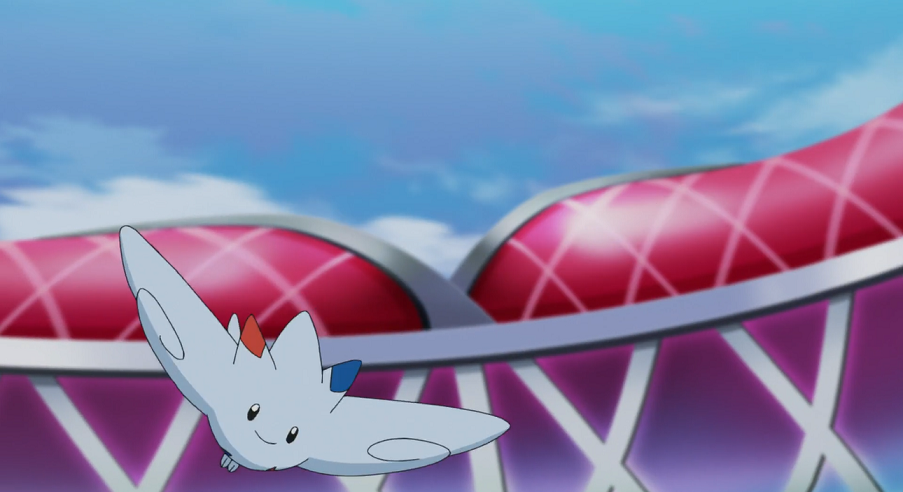 Cynthia wechselt erneut und schickt Togekiss für Kryppuk in den Ring. Ash entscheidet sich für Pikachu als nächstes Pokémon. Damit scheint Cynthia gerechnet zu haben. Pikachu beginnt damit, Togekiss mit Donnerblitzen zu attackieren, jedoch kann das Fee-Flug-Pokémon diesen ausweichen und Pikachu selbst mit Luftschnitten treffen. Mit Zen-Kopfstoß möchte es daraufhin nachlegen. Pikachu versucht, das auf es zufliegende Togekiss mit Elektronetz zu stoppen, kann jedoch nicht reagieren, da es durch Luftschnitt und durch Togekiss' Fähigkeit Edelmut zurückgeschreckt ist, und wird getroffen.