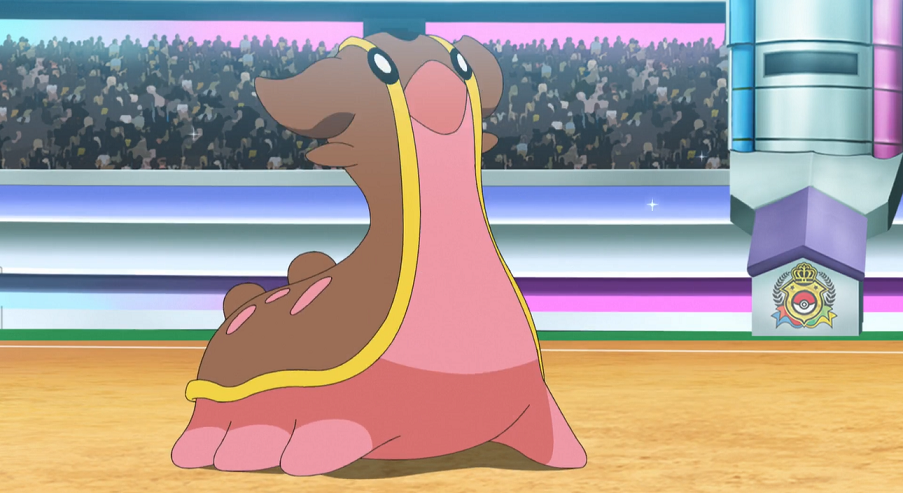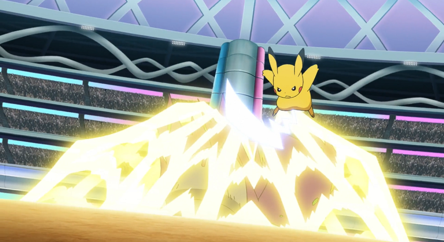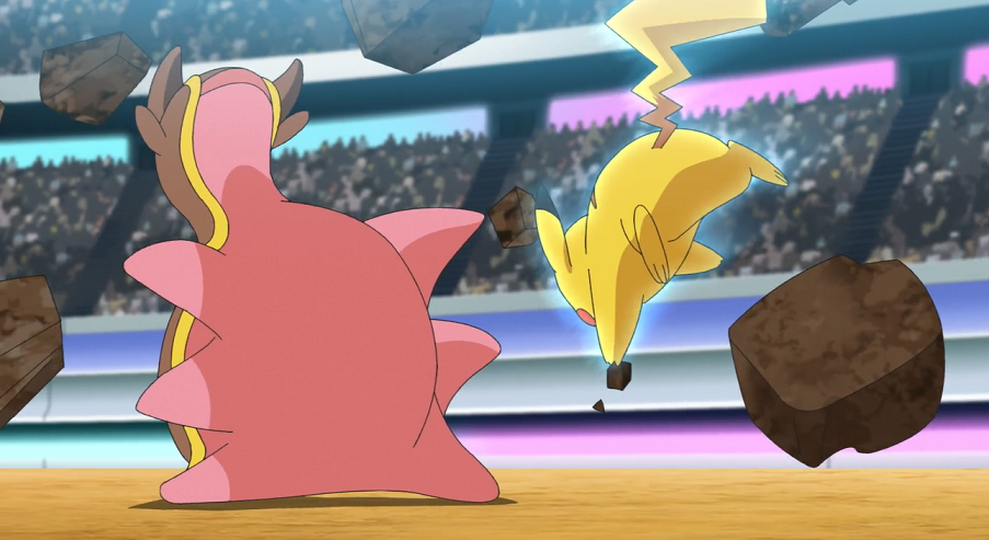 Pikachu kann sich wieder aufrappeln und sieht dann, dass Cynthia Togekiss gleich wieder auswechselt, um es durch Gastrodon zu ersetzen. Dieses beginnt sofort, mit Erdkräfte anzugreifen. Pikachu wird durch den aufgerissenen Boden in die Luft geworfen, kann aber von Bodenstück zu Bodenstück und so noch höher in die Luft springen, um zu einer Eisenschweif-Attacke anzusetzen. Cynthia hat damit gerechnet und lässt Gastrodon mit Steinkante kontern. Doch auch Ash hat darauf eine Antwort und lässt Pikachu die beiden aus dem Boden aufkommenden Steinspitzen mit Eisenschweif nacheinander halbieren. Pikachu schleudert die abgetrennten Steinteile dann auf Gastrodon, das beinahe von diesen begraben wird. Schnell legt Pikachu mit Ruckzuckhieb nach und kann das beladene Gastrodon treffen und so besiegen.