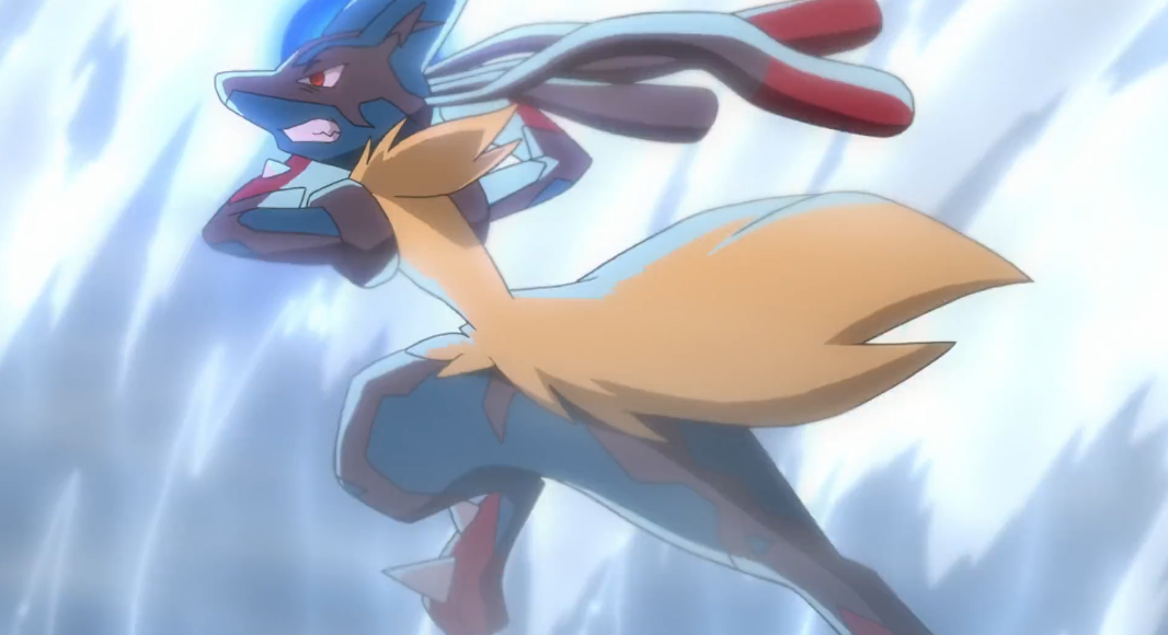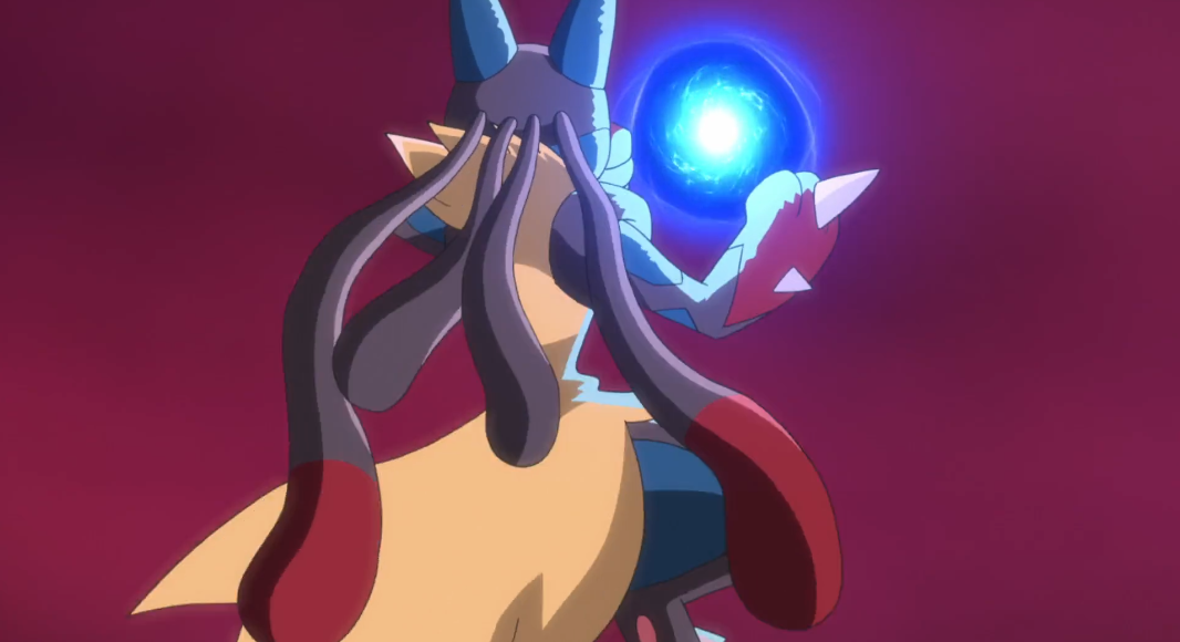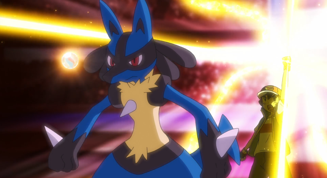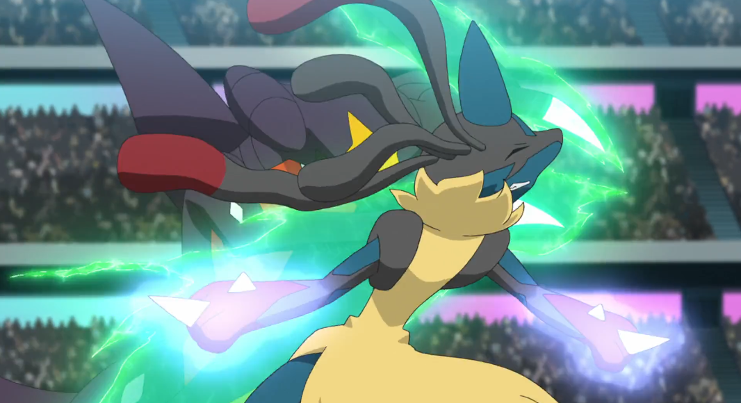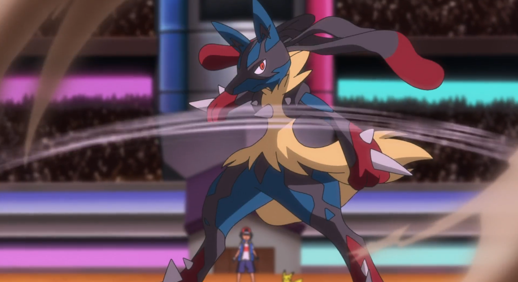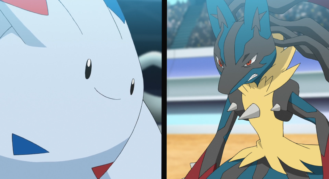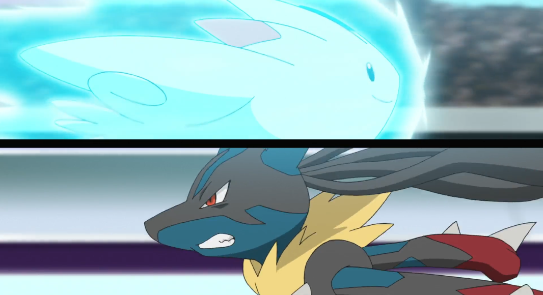 Ash beschließt direkt die Mega-Entwicklung von Lucario einzusetzen, sodass sich sein Pokémon zu einem Mega-Lucario entwickelt. Diantha und Delion, die den Kampf ebenfalls verfolgen, bewerten diesen Schachzug als einen wahrhaftigen Halbfinalkampf und sind gespannt wer sich als Sieger hervortun kann. Ash zögert nicht lange und befiehlt Mega-Lucario Aurasphäre einzusetzen, worauf Cynthia ihrem Togekiss zuruft, dass dieses Dyna-Düse einsetzen soll. Togekiss Attacke rast schnell auf Mega-Lucario zu, welches mutig die erzeugten Windböen nutzt, um in ihnen hinaufzuspringen und so die Distanz zu Togekiss zu verkleinern.