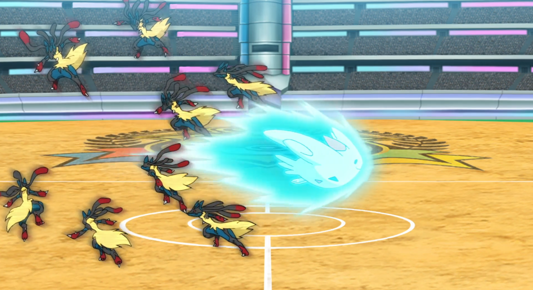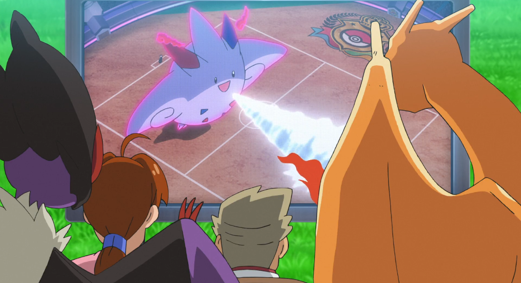 Wieder in normaler Form schafft es jedoch erneut sich aufzurappeln und eine weitere Geschwindigkeitserhöhung zu erhalten. Ashs Mega-Lucario ist von der Anstrengung des vorherigen Einsatzes der Attacke sichtlich erschöpft, während Togekiss nach wie vor glücklich aussieht. Auch die Zuschauenden sind von diesem Kampfesfortschritt sichtlich beeindruckt und jubeln. Delion erkennt, dass Ash es sogar während des Kampfes schafft sich weiterzuentwickeln, jedoch sagt er gleichzeitig auch, dass bloßer Einsatz von Kraft nicht gegen Cynthia ausreichen werde. Diantha, welche sich mit Delion unterhält, erinnert sich an die Worte, die Cynthia zuvor an sie gerichtet hatte: Cynthia wolle nach dem Ende der Kämpfe in der Pokémon-Krönungs-Weltmeisterschaft aufhören an Pokémon-Kämpfen teilzunehmen. Auch Cynthia scheint dieses Vorhaben gerade durch den Kopf zu gehen, da die anerkennt, dass sie an dem Kampf gegen Ash viel Spaß hat und damit glücklich ist.