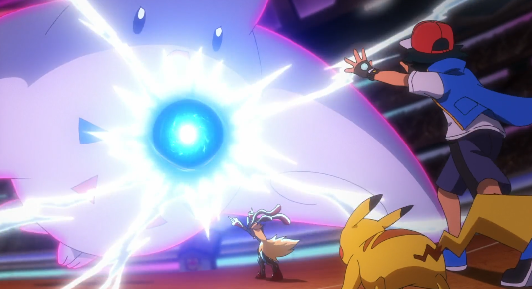 Sowohl die zuschauenden Professor Eich, Ashs Mutter, Goh und Hop, als auch Cynthia sind von dieser Taktik überrascht. Als Mega-Lucario im Luftwirbel emporgestiegen ist, schießt es seine Aurasphäre-Attacke los, jedoch schafft diese es nicht schnell genug zu fliegen, um Togekiss zu erreichen. Stattdessen setzt dieses seine Dyna-Düse-Attacke so ein, dass die Sphäre von Mega-Lucario zerstört wird und somit unwirksam gemacht wird. Ash, Pikachu und Mega-Lucario sind davon sichtlich überrascht – obendrein wird durch den Einsatz von Dyna-Düse Togekiss Geschwindigkeit erhöht.